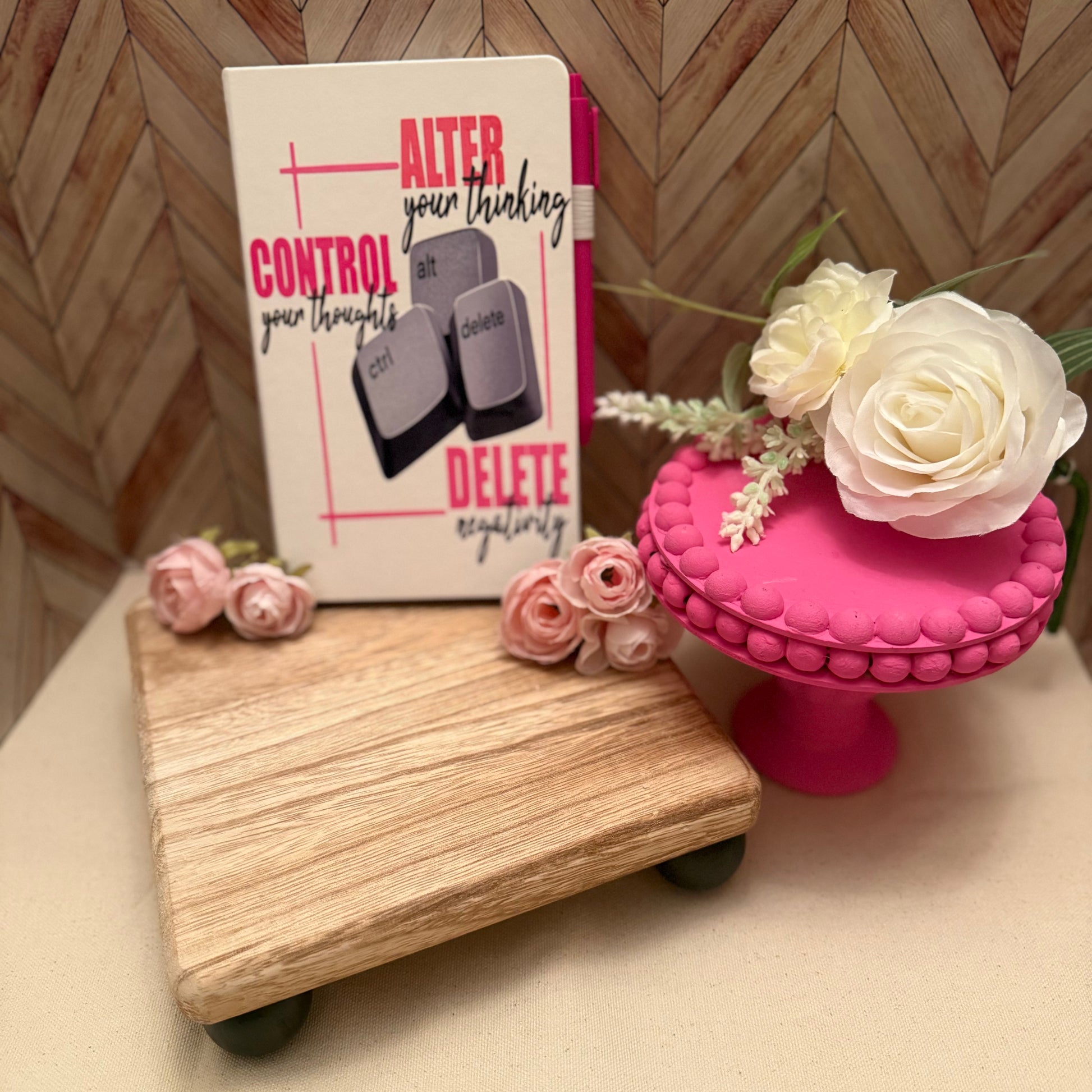 This A5 lined journal, titled "Alter Your Thinking," is designed to help you cultivate positive mental habits by encouraging thought control and eliminating negativity. It includes a pen, a convenient pen holder, and ribbon bookmarks for easy organization. Ideal for daily reflections and mindful writing, this journal supports a focused and intentional mindset.