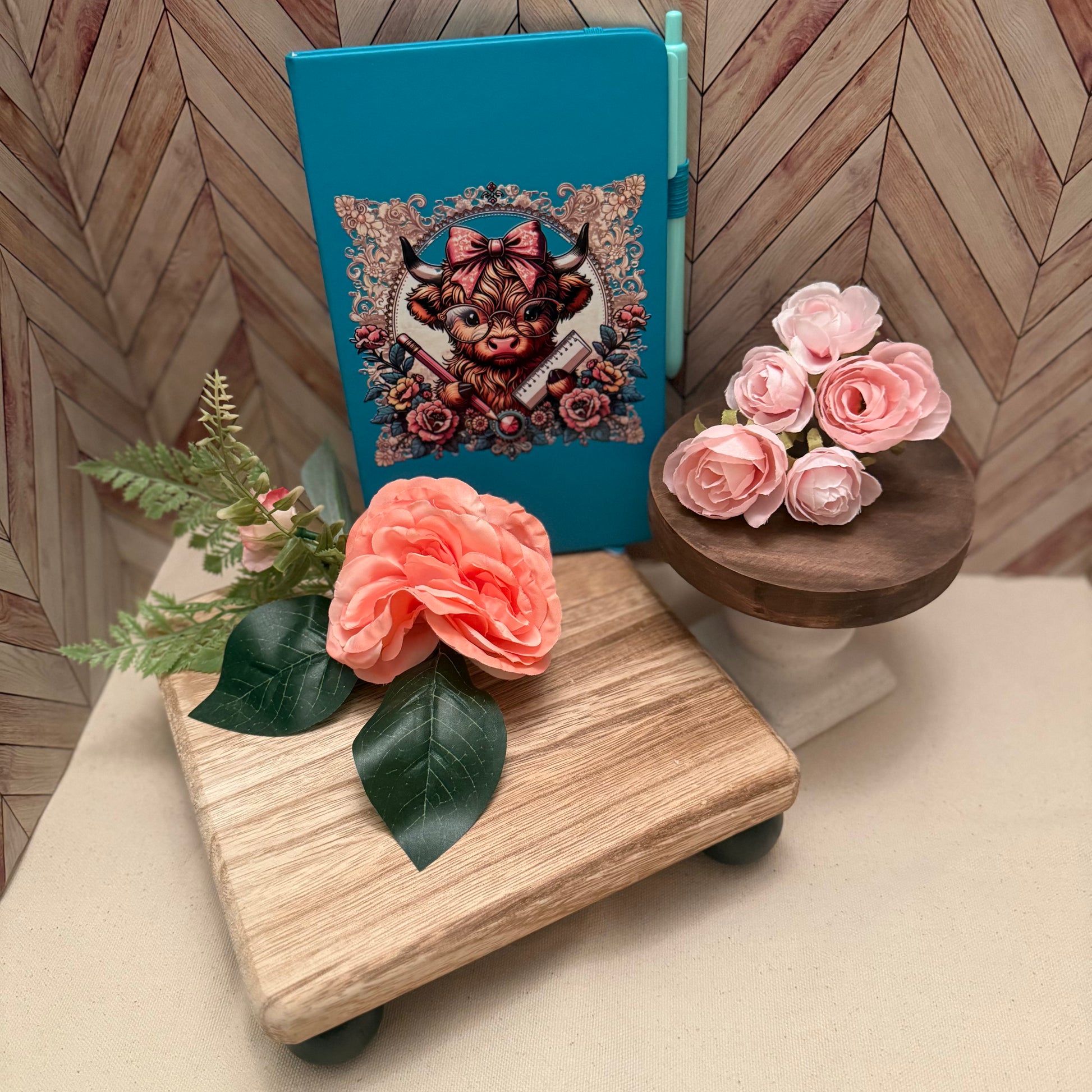 Capture your thoughts and notes in this A5 lined journal adorned with an adorable highland cow illustration surrounded by school items. Designed for practicality, it includes a pen holder and ribbon place markers for easy organization and access. Perfect for students, professionals, or anyone who appreciates functional charm in their stationery.