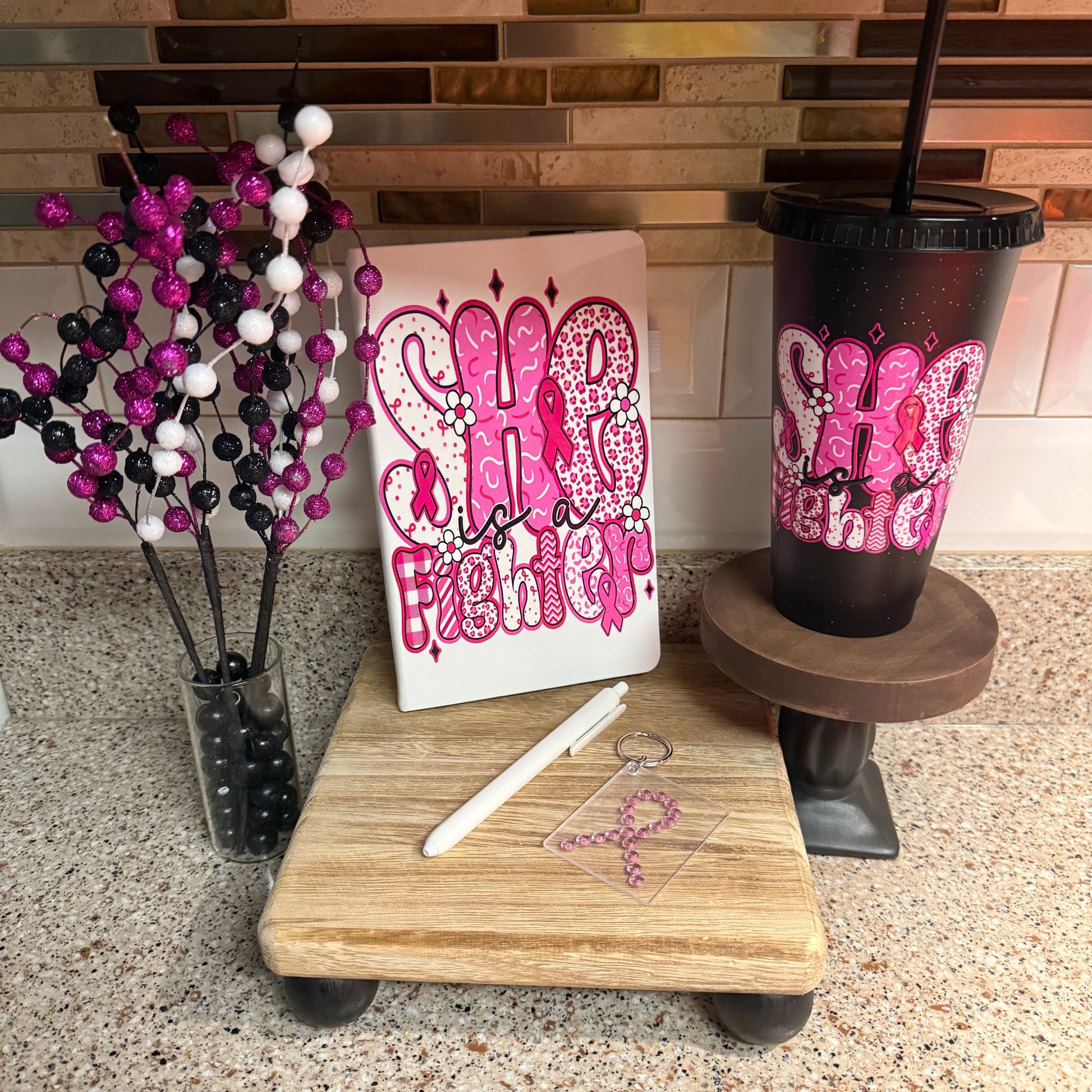 The She is a Fighter Journal Set is thoughtfully designed to support and inspire those facing breast cancer. It includes a beautifully crafted A5 lined journal, a matching pen, a coordinating cup, and a keychain, all in an elegant palette of white, black, and shades of pink. This set offers a meaningful way to document thoughts, stay motivated, and embrace strength throughout the journey. Ideal for personal use or as a heartfelt gift, it brings both function and encouragement in one cohesive package.